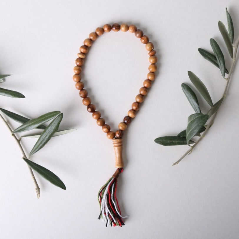 This is one of the most gorgeous tasbih’s I’ve seen, with hand crafted beads made from aged Palestinian olive wood. There’s also something really grounding about using a wooden tasbih — the natural warmth feels is more pleasant than the cold touch of a stone misbaha.